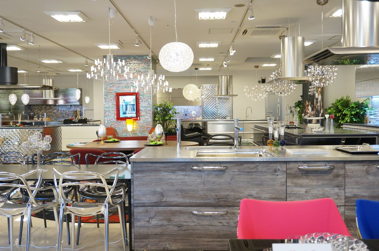 トーヨーキッチン広島ショールームの店内はモーイ(moooi)の照明が映える、トーヨーキッチンスタイルな世界観の店内。